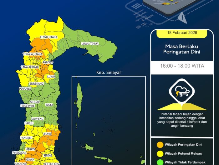 Dalam peringatan dini, BMKG mengimbau masyarakat untuk waspada terhadap potensi angin kencang di wilayah Sulawesi Selatan bagian barat dan selatan. Prakiraan ini dikeluarkan Prakirawan BMKG Makassar pada 18 Februari 2026 pukul 14.00 WITA.